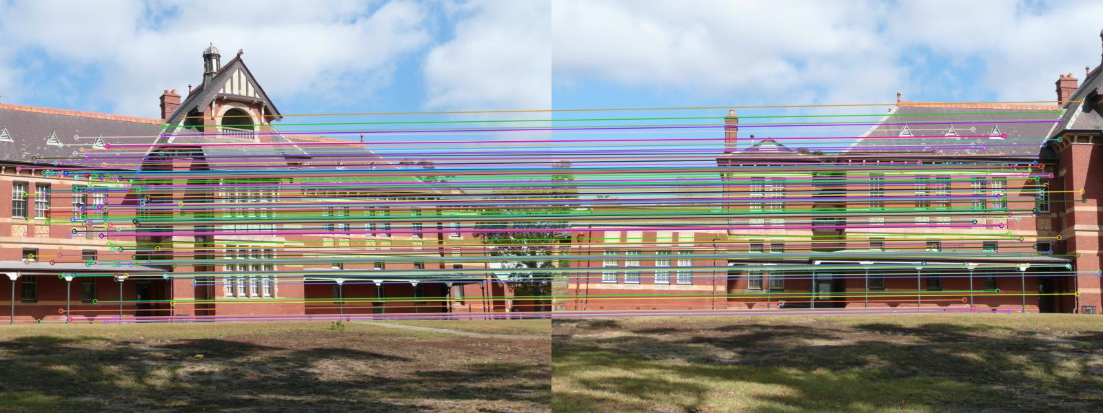 As a test for the verification of the Keypoints and the descriptors our implementation produces, we decided to use them to do image stitching. Firstly, the use of invariant features (SIFT features in this case) enables reliable matching of panoramic image sequences despite rotation, zoom and illumination change in the input images. Here are a few examples illustrating the use of the features that we generate to first do feature matching and then use the matches to find the homography and stitch the images.